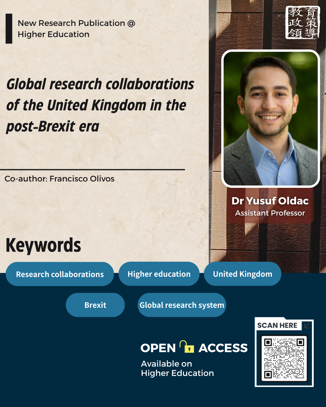 We would like to extend our congratulations to Dr Yusuf Oldac, Assistant Professor of the Department of Education Policy and Leadership, of his lastest research publication titled "Global research collaborations of the United Kingdom in the post-Brexit era", co-authored with Francisco Olivos, in Higher Education.