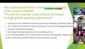 Led by Dr. Percy Kwok (The Department of Education Policy and Leadership, EdUHK), another Collaborative Online International Learning (COIL) project entitled “Pre-service teacher cross-cultural exchanges through global teaching experiences” among five international universities in Asia, Europe, and Oceania in 2025-26. The organizers are Dr. Jennifer Cutri and Dr. Gerarda Richards (Swinburne University of Technology, Melbourne, Australia), Prof. Yufeng Zhang (Beijing Normal University, Beijing, China), Prof. Tae-Hee Choi (University of Southampton, England, the United Kingdom), and Prof. Ismail Celik and Prof. Signe Siklander (University of Oulu, Finland).