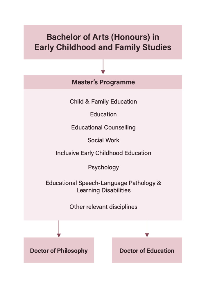 Note: Students who did not complete a postsecondary programme in Early Childhood Education (ECE) before admission to the BA(ECFS) programme are required to study a 3-cp bridging course in the first semester of Entry-year, PSY2096 Child Development. The Major Study and Final Year Project requirements of these students would be 42 cps (i.e, 63 cps for the whole programme).