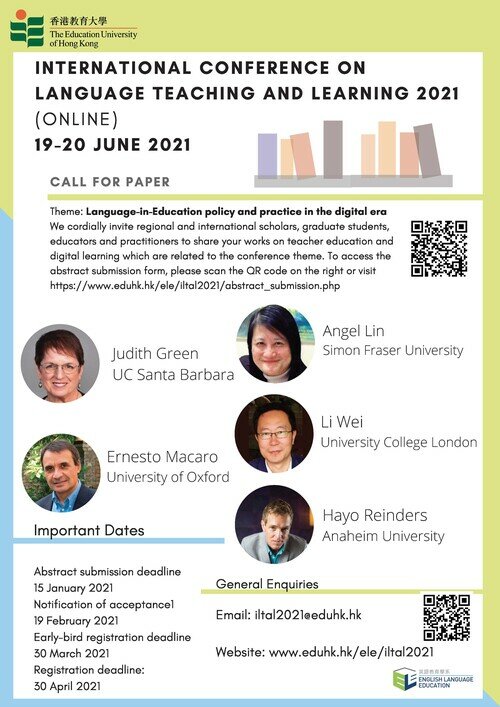 Following the success of the 2019 Inaugural International Conference on Language Teaching and Learning, the Department of English Language Education held “The 2nd International Conference on Language Teaching and Learning” from 19 to 20 June 2021 online. The theme this year was “language-in-education policy and practice in the digital era”, aiming to explore how technology impacted policy, curriculum, and pedagogy in language education and how it would impact the future of language policy and practice and our society. The conference featured prominent leading scholars in the fields, including Professor Judith Green (University of California, Santa Barbara, USA), Professor Angel Lin (Simon Fraser University, Canada), Professor Li Wei (University College London, UK), Professor Ernesto Macaro (University of Oxford, UK) and Professor Hayo Reinders (Anaheim University, USA). Lively discussions then continued across five parallel sessions and 90 paper presentations contributed by 102 researchers and teachers from Asia, Australia, Europe and North America.