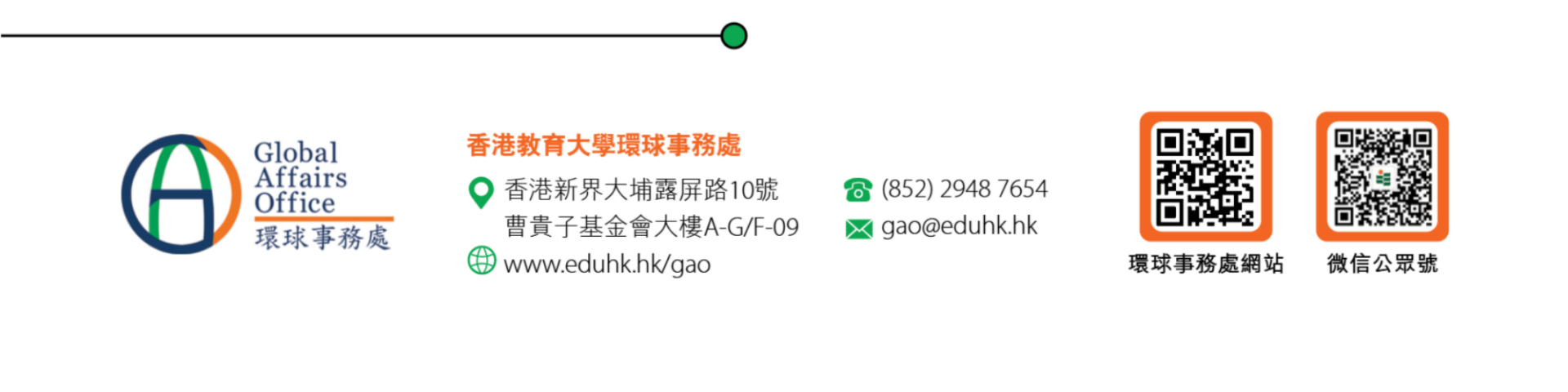 電話:(852) 2948 7654傳真:(852) 2948 8189電郵:gao@eduhk.hk地址:香港新界大埔露屏路十號 香港教育大學行政大樓A-G/F-09室 環球事務處網址:https://www.eduhk.hk/gao