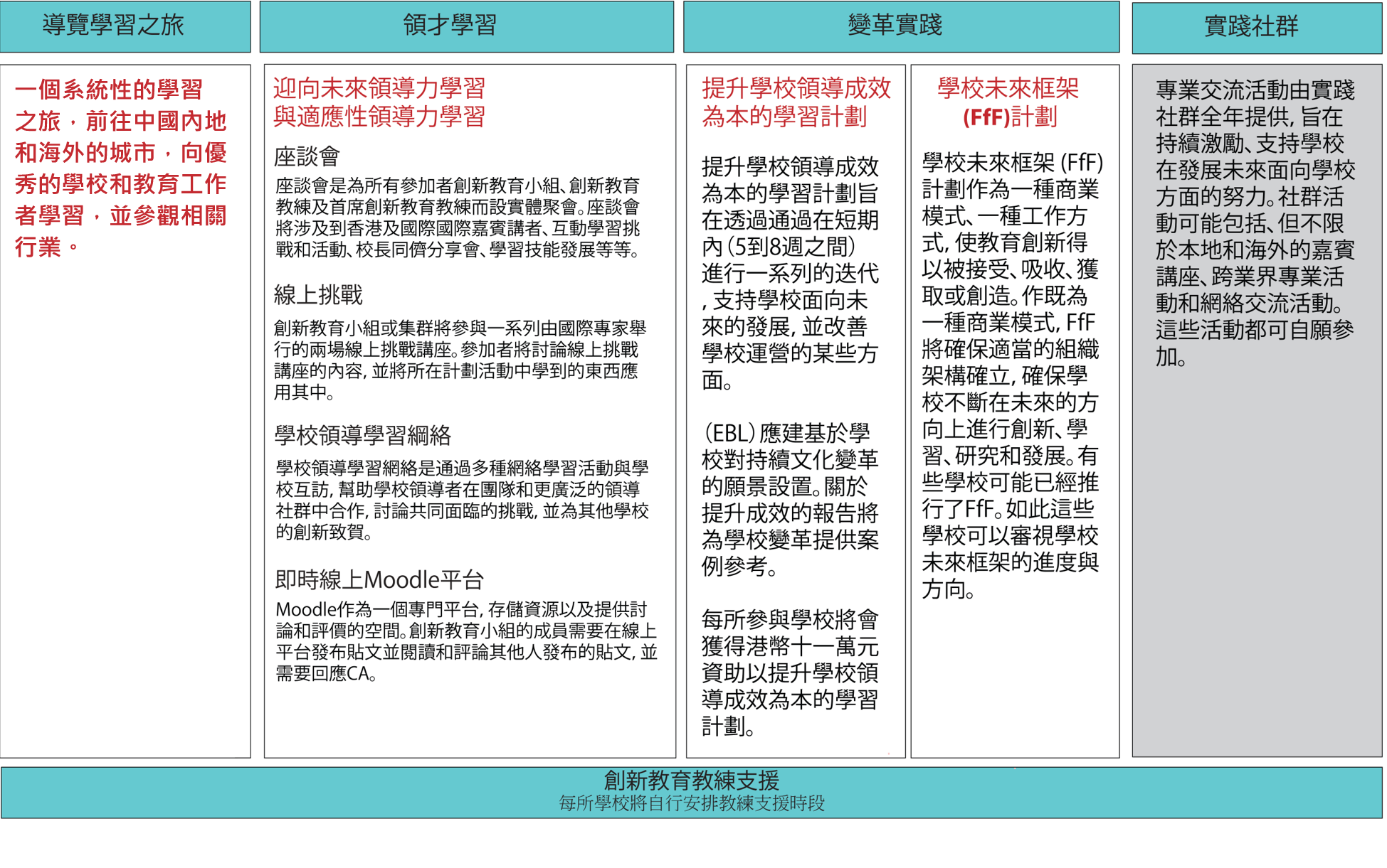 創新教育小組是本計劃的核心。所有小組由一名學校校長及兩名來自同一學校的領導者組成。