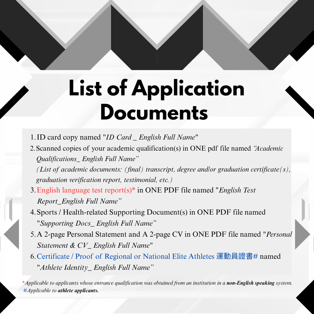 - (vi) Certificate / Proof of Regional or National Elite Athletes 運動員證書# named "Athlete Identity_Your English Full Name”