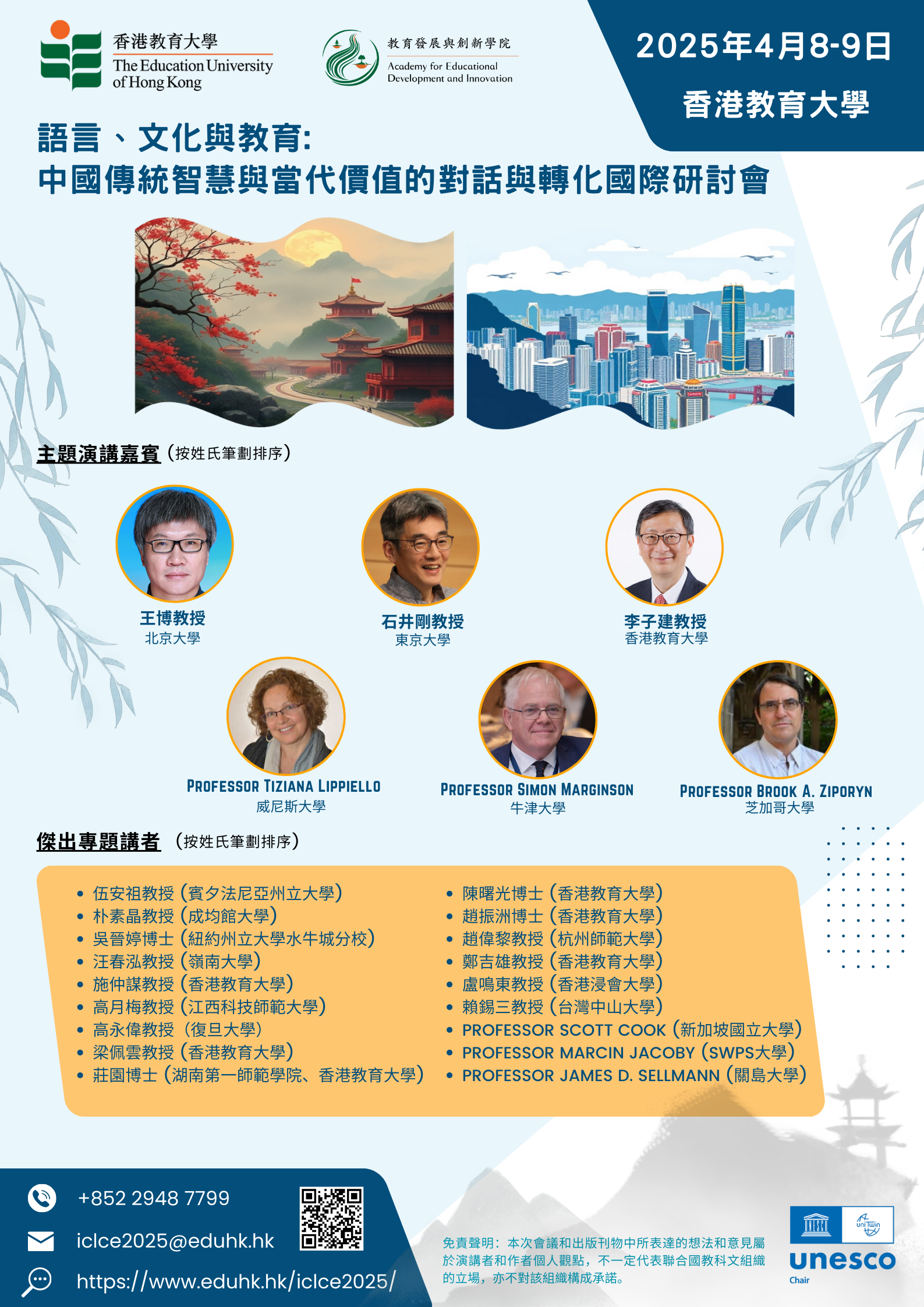 香港教育大學教育發展與創新學院將於2025年4月8-9日舉辦大型國際研討會,探索中國傳統智慧與當代價值理念之間的建構與轉化。為了促進跨時空與跨文化的深度對話,會議擬從語言、文化和教育三大領域切入,並以聯合國2030年可持續發展議程的五大支柱——人類、地球、繁榮、和平與合作關係(Tremblay et al., 2020)為框架,考察中國文化與當代價值對話和相互融合的可能。是次研討會希望提供一個貫通古今、融匯中西的學術平台,凝聚世界各地不同背景的學者,集思廣益,共同提煉真知,豐富學術界對可持續發展、公平,以及和平世界的思考與實踐,為人類未來發展提供一幅嶄新而務實的文化藍圖。