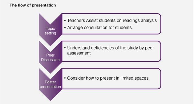 By using poster in presentations, students are required to think thoroughly how to manage their presentation in limited spaces. Also, peer assessments can be obtained by multiple groups of teachers and students at the same time, giving students a chance to reflect. Students have only 5 minutes to present their own ideas to teachers and students with the aid of their poster. So that they ought to intensify the details in their poster, then summarise the report and carry out evaluation.