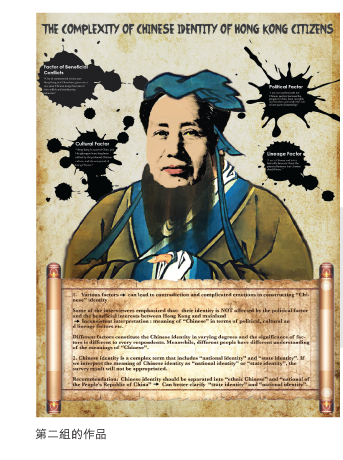「我們對這次海報設計很有成功感。海報簡報工作坊能給予設計上的意 念。而我們組選擇了一個市場導向的海報設計,以圖像(孔子身、毛澤 東臉)為主,輔 |