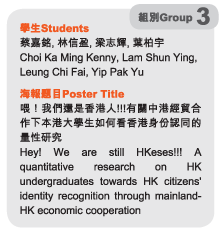 Students at primary, secondary and tertiary level have all had the experience of carrying out group enquiry. Nevertheless, group enquiry has not always been the most effective teaching and assessment tool, given that there is insufficient relevant training for students in the curriculum. This project aims to help students master and apply what they have learnt to the investigation of social phenomena in everyday life. With the added component of poster presentation assessment, this project also equips students with the knowledge and skills to construct arguments and disseminate their research.