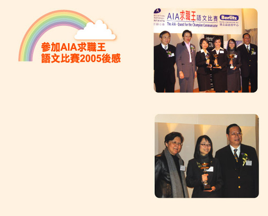 張彩虹從立法會主席范徐麗泰議員手上接過AIA求職王語文比賽2005初賽冠軍獎項。