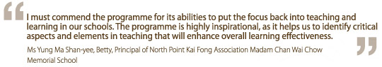 Since its establishment in 2001, the Centre for Learning-study and School Partnership has been playing a pivotal role in the development of partnerships with local schools. Between 2004 and 2006, the Centre organised a series of Mentorship Training Programmes for Principals, which received very positive feedback from participants. The Programme is designed to focus particularly on the needs of principals and their leadership role in supporting mentorship development in schools. It highlights the practical aspects, showing how principals can translate and apply the mentoring concept to support development within their own schools. |