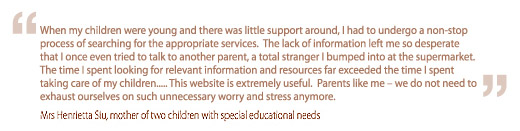 Connected Online - Website Launched for Special Education needs When my children were young and there was little support around, I had to undergo a non-stop process of searching for the appropriate services.  The lack of information left me so desperate that I once even tried to talk to another parent, a total stranger I bumped into at the supermarket.  The time I spent looking for relevant information and resources far exceeded the time I spent taking care of my children..... This website is extremely useful.  Parents like me – we do not need to exhaust ourselves on such unnecessary worry and stress anymore. Mrs Henrietta Siu, mother of two children with special educational needs