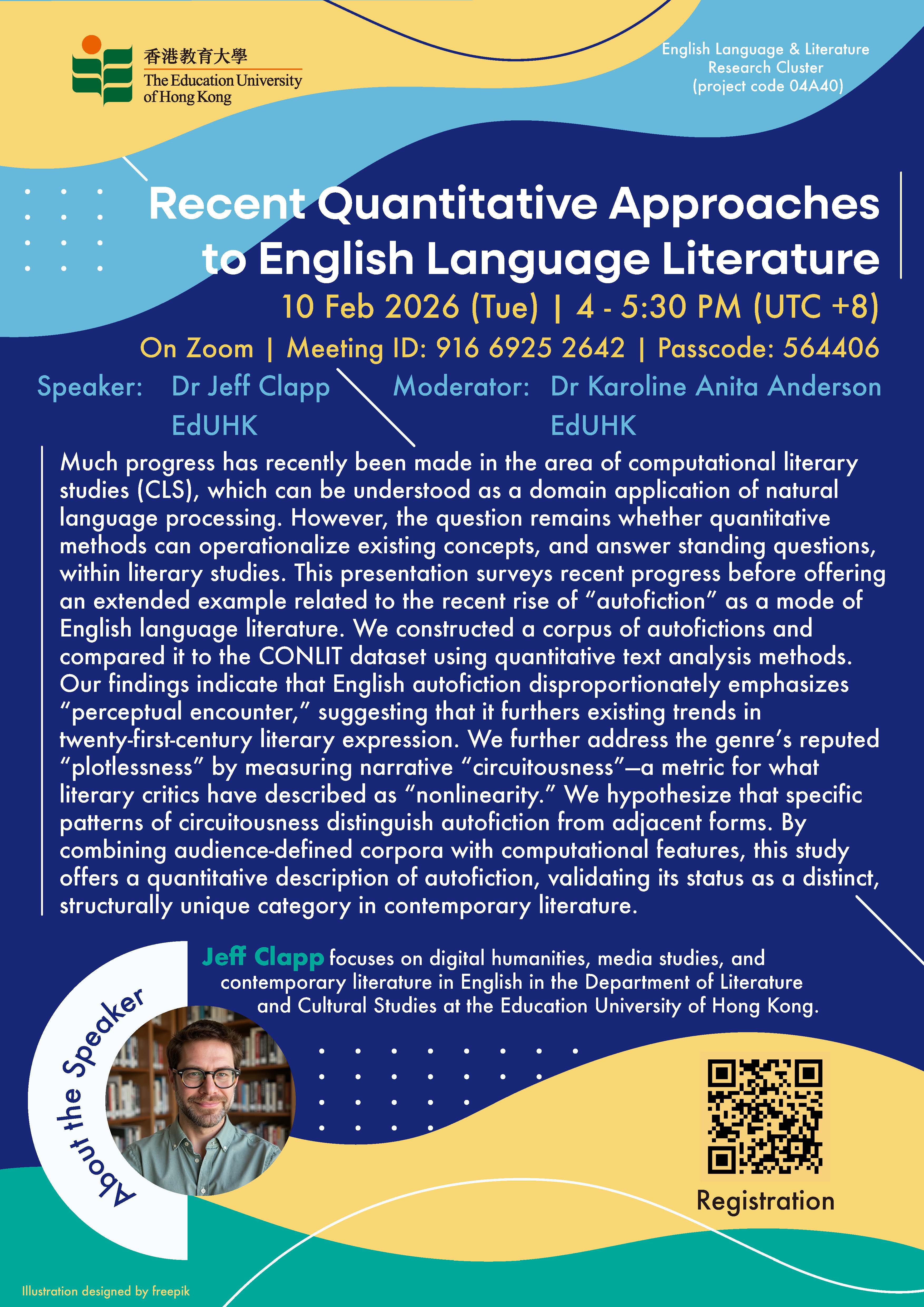 You are cordially invited to a talk on “Recent Quantitative Approaches to English Language Literature” organized by the English Language and Literature Research Cluster. Details of the talk are as follows: