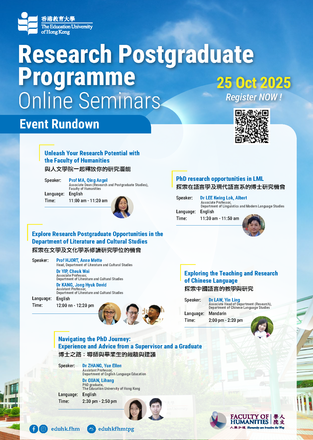 The Faculty of Humanities will host the Research Postgraduate Programme Online Seminars on 25 October 2025 (Saturday). This aims at providing useful and updated information about the Research Postgraduate Programme covering different areas of expertise including Cultural and Creative Arts, Cultural Studies, History, Language Education, Linguistics and Literature. There will be a Q&A session. Interested students are welcome to join us.