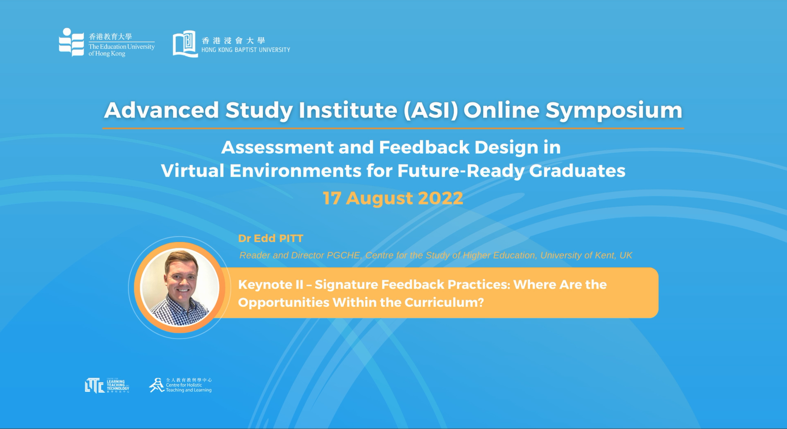 The Education University of Hong Kong (EdUHK) actively participated in the Advanced Study Institute (ASI) Online Symposium on 17-18 August 2022, with the theme “Assessment and Feedback Design in Virtual Environments for Future-Ready Graduates”.