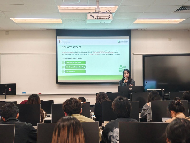 Miss GU Jiahe from the Department of Curriculum and Instruction presented her findings on “GenAI-Empowered Self-Assessment in Higher Education”. Grounded in social cognitive theory and metacognitive frameworks, she developed a self-reflection tool integrated with generative AI and utilised a mixed-methods approach to analyse cognitive and behavioural patterns of university students using AI-generated feedback in writing tasks.