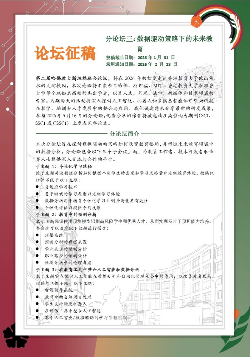 Harvard-EdUHK-Stanford Joint Symposium “Emerging Technologies and Future Talents" 日期:2026-05-15 时间:10:00:00 https://harvardces.eduhk.hk/