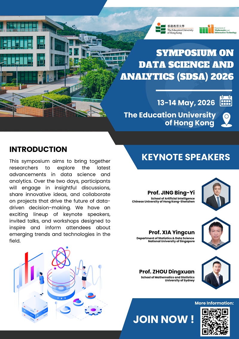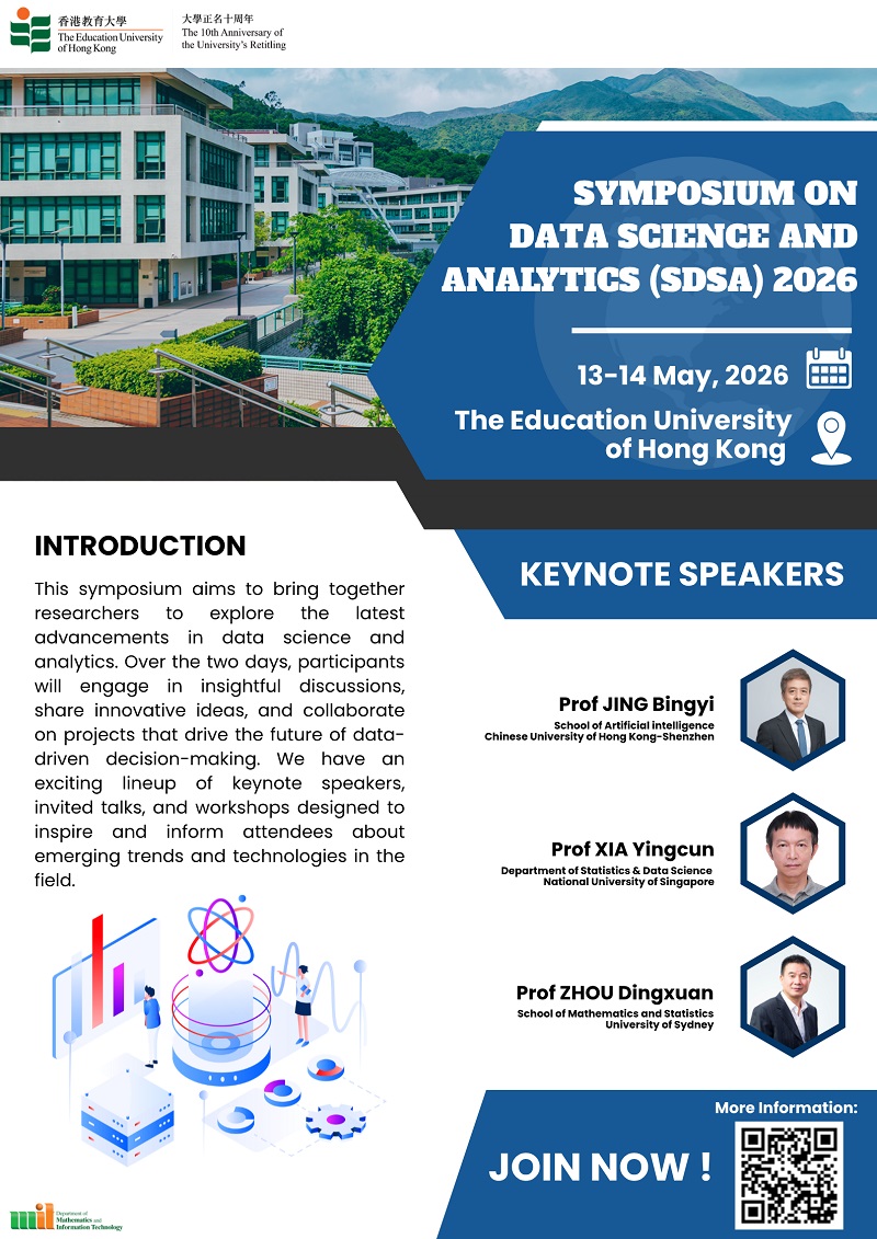 The Symposium on Data Science and Analytics will be held on May 13-14, 2026 at the Education University of Hong Kong (EdUHK). This symposium aims to bring together researchers to explore the latest advancements in data science and analytics. Over the two days, participants will engage in insightful discussions, share innovative ideas, and collaborate on projects that drive the future of data-driven decision-making. We have an exciting lineup of keynote speakers, invited talks, and workshops designed to inspire and inform attendees about emerging trends and technologies in the field.