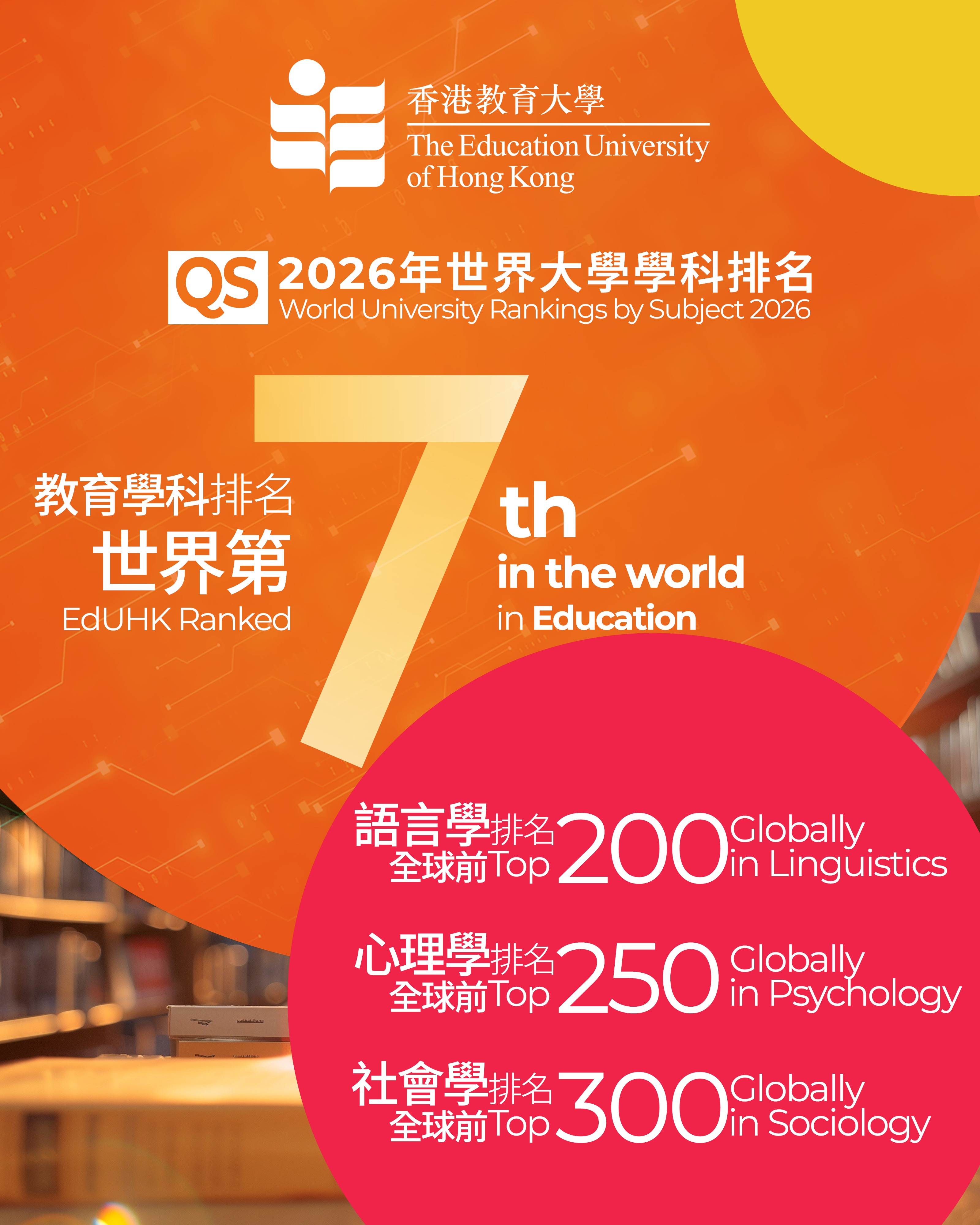 教大教育學科排名創歷史新高 於2026 QS世界大學學科排名列全球第七位