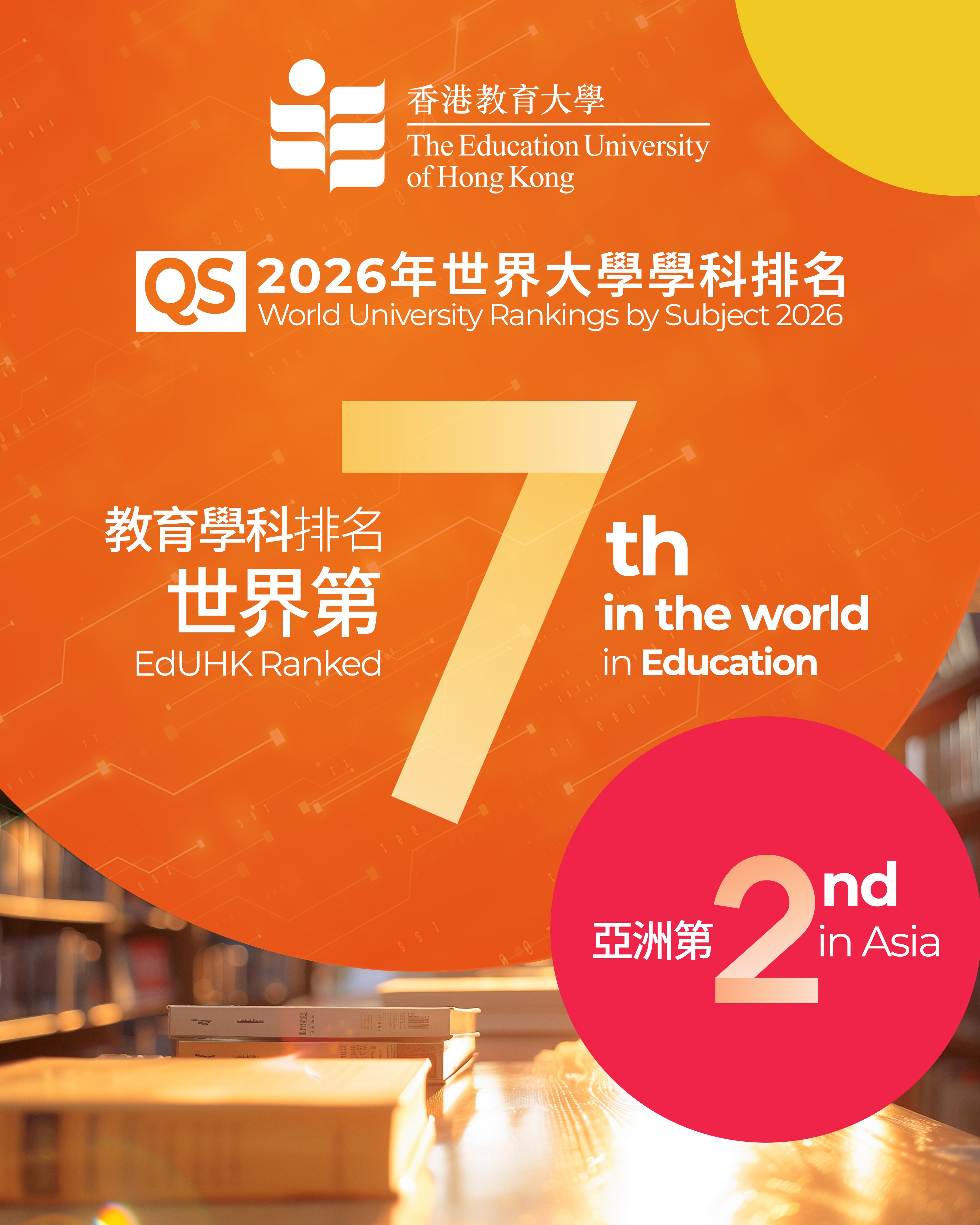 香港教育大學(教大)今天(3月25日)欣然宣佈,教大的教育學科於最新公佈的「2026年QS世界大學學科排名」中,躍升至全球第七位、亞洲第二,創下歷史新高,成績令人鼓舞。連續三年的進步,成為教大發展的重要里程碑,亦進一步彰顯教大在教育領域的專業地位,受到國際學術界高度認可與肯定。