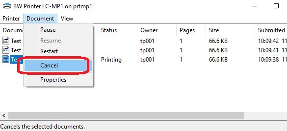 Once you find you have sent a wrong document and the document is not yet printed, you can cancel the print job. To cancel the job, select the print job first, then choose Document -> Cancel.