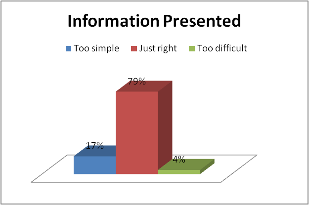 Q2. How useful is the information presented in the training session? Findings: 83% of the attendees found that the information presented in the class is useful and 17% of attendees found that only some information are useful. Q3. Is the information presented in the right level? Findings: About 96% of the attendees found that the information presented in the training is at the right level.