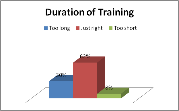 Q4. Please comment on the duration of the training. Findings: 62% of the attendees found that the duration of the training is just right.