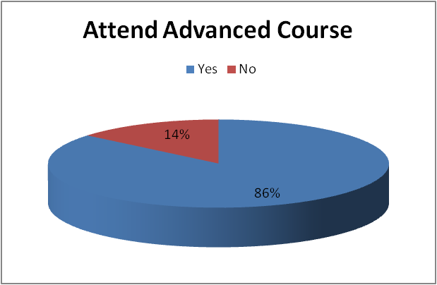 Q6. Please comment on the presentation skill of the trainer(s). Findings: About 98% of the attendees rated the presentation skill of the trainer to good or above. Q7. Please comment on the training facilities and environment. Findings: About 79% of the attendees rated the training facilities and environment to good or above. Q8. Please rate your overall satisfaction. Findings: About 91% of the attendees rated the satisfaction level of the courses to good or above. Q9. Would you like to attend a more advanced training of this subject in the future? Findings: 86% of the attendees would like to attend more advanced training courses in the similar subjects in the future.
