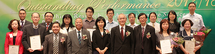 President’s Award for Outstanding Performance in Teaching 2012/13  | Individual Award | | 1. | Dr Cheng Nga-yee, Irene, Assistant Professor, Department of Science and Environmental Studies | | 2. | Dr Ma Wai-wing, Ada, Assistant Professor, Department of Health and Physical Education | President’s Award for Outstanding Performance in Research 2012/13  | Research Excellence Award | | 1. | Professor Lo Sing-kai, Chair Professor of Social Research, Faculty of Liberal Arts and Social Sciences | | 2. | Dr Wong Wing-sze, Associate Professor, Department of Psychological Studies |  | |  | Early Career Research Excellence Award | | 1. | Dr Chin Chi-on, Assistant Professor, Department of Linguistics and Modern Language Studies | | 2. | Dr Chow Cheuk-fai, Stephen, Assistant Professor, Department of Science and Environmental Studies | President’s Award for Outstanding Performance in Administrative Services 2012/13  | | | 1. | Ms Lee Ching, Jane, Executive Officer I, Department of Social Sciences | | 2. | Mr Wong Hang-kuen, Computer Operator, Office of Information Technology and Services |  | |  | Team Award | | | A team comprising Dr Fung Shu-fun, Associate Professor, Department of Literature and Cultural Studies; Mr Mr Lok Wai-ho, Rico, and Mr Wong Koon-fung, Job, Assistant Project and Facility Managers, Estates Office; Mr Wong Man-lee, Edward, Computer Officer, Office of Information Technology and Services; and Miss Yeung Hang-fan, Alice, Executive Officer I, Estates Office (at the Tseung Kwan O Study Centre) | |