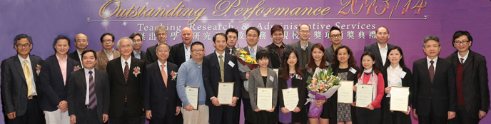 President’s Award for Outstanding Performance in Teaching 2013/14  | Individual Award | | 1. | Dr Law Kam-yee, Associate Professor, Department of Social Sciences | | 2. | Dr Wang Lixun, Associate Professor, Department of Linguistics and Modern Language Studies | President’s Award for Outstanding Performance in Research 2013/14  | Early Career Research Excellence Award | | 1. | Dr He Jingwei, Alex, Assistant Associate Professor, Department of Asian and Policy Studies | | 2. | Dr Liu Duo, Assistant Professor, Department of Special Education and Counselling | President’s Award for Outstanding Performance in Administrative Services 2013/14  | | | 1. | A team comprising Ms Cheung Wing-yin, Winnie, Executive Officer I, Faculty of Liberal Arts and Social Sciences; Ms Chung Hiu-po, Catherine, Executive Officer I, Faculty of Liberal Arts and Social Sciences; Miss Fok Wing-man, Fiona, Executive Officer II, Faculty of Liberal Arts and Social Sciences; Ms Kwan Hung-hung, Tanya, Clerical Officer II, Faculty of Liberal Arts and Social Sciences; Mr So Ting-fung, Adrian, Clerk, Faculty of Liberal Arts and Social Sciences, and Dr Yu Kar-ming, Assistant Professor, Department of Asian and Policy Studies |  | | | 2. | A team comprising Ms Cheng Lai-han, Margaret, Clerical Officer II, Office of the Chief Information Officer; Ms Chun Chui-ying, Eva, Clerical Officer II, Office of the Chief Information Officer; and Ms Shing Wai-man, Bonnie, Executive Officer I, Office of the Chief Information Officer | |