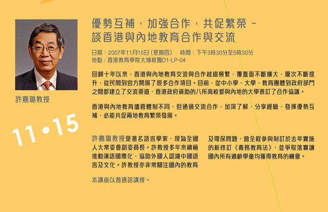 許教授於十一月十五日之公開講座現已取消。