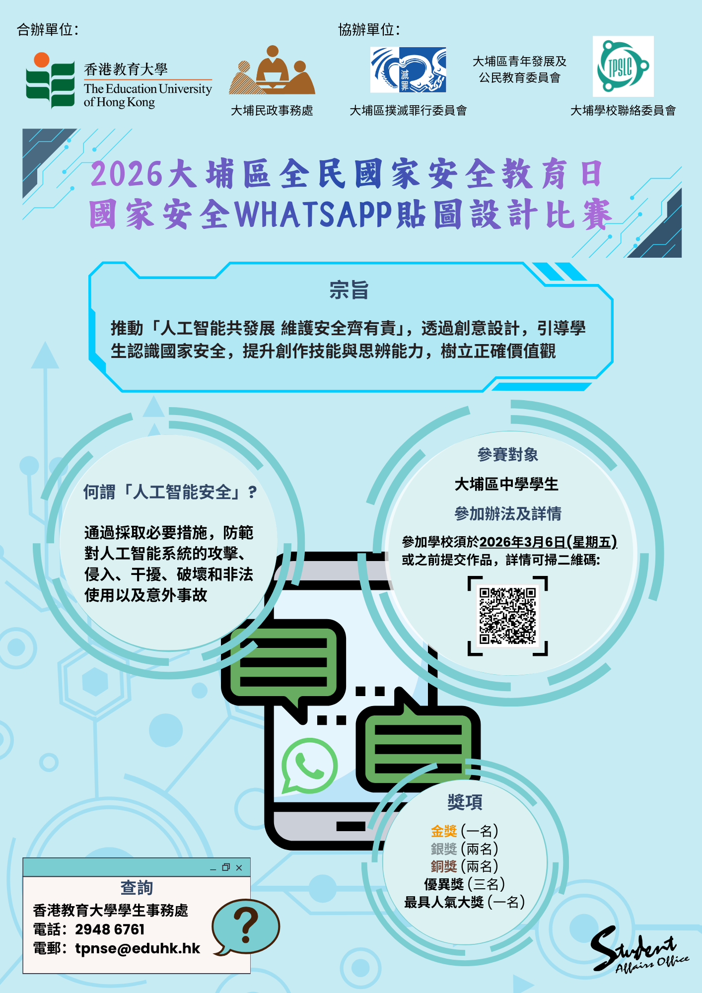 總體國家安全觀強調要以整體角度全盤理解和維護國家的整體安全,突出的是「大安全」概念,涵蓋二十個環環相扣的重點領域,其中「人工智能安全」也是非傳統安全的重點領域之㇐。人工智能安全是指通過採取必要措施,防範對人工智能系統的攻擊、侵入、干擾、破壞和非法使用以及意外事故,使人工智能系統處於穩定可靠運行的狀態,以及遵循人工智能以人為本、權責㇐致等安全原則,保障人工智能演算法模型、數據、系統和產品應用的完整性、保密性、可用性、穩健性、透明性、公平性和隱私的能力。本年度的WhatsApp 貼圖設計比賽,以「人工智能安全」為主題,推動「人工智能共發展 維護安全齊有責」。通過比賽提高學生對人工智能安全的認識,讓大埔區學生更深入地了解國家安全的重要性,培養他們的創作技巧,激發他們思考和塑造正確之價值觀。