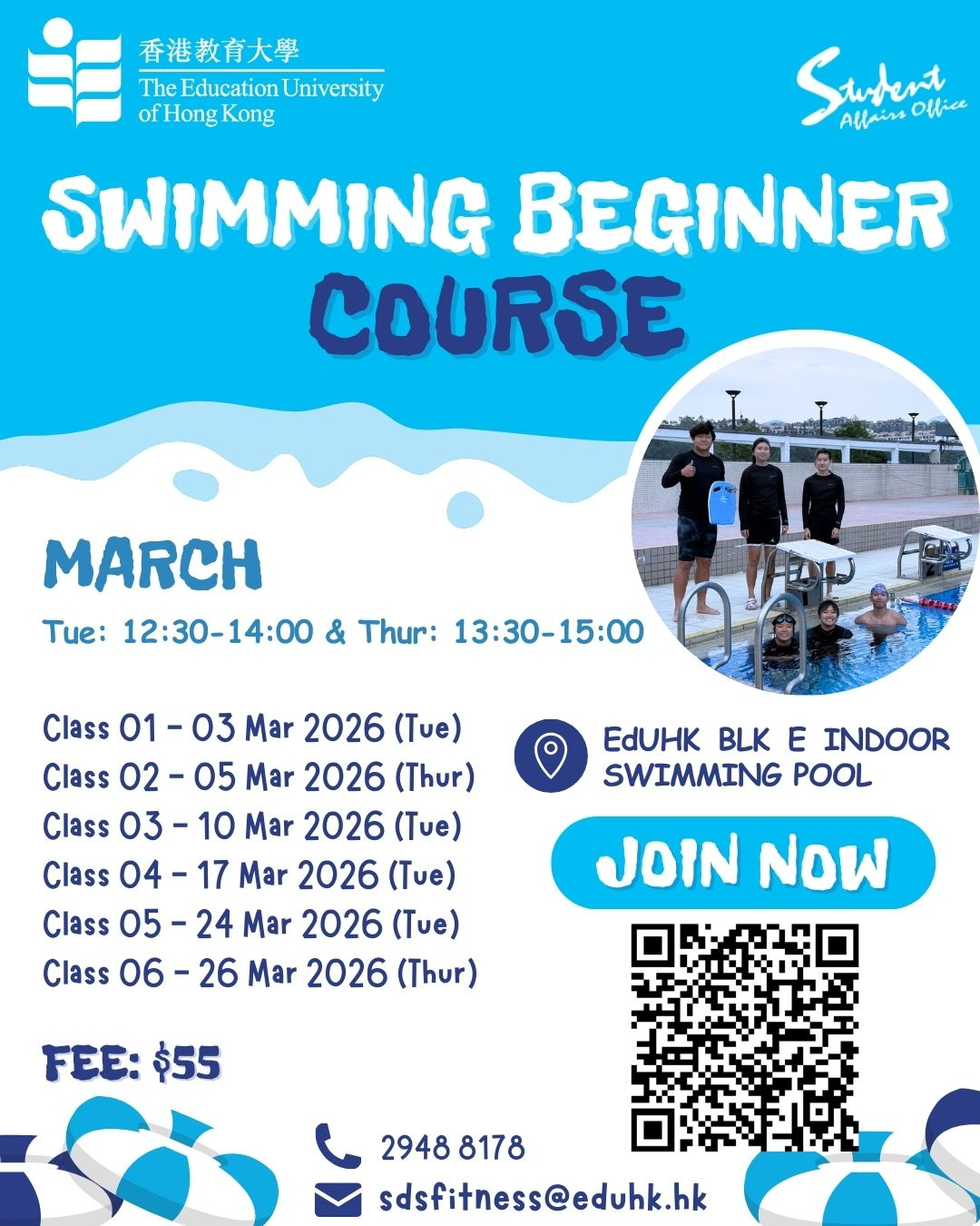 The Sports Development Section at the Student Affairs Office offers various sports courses and workshops with the aim to enable students to acquire new sports skills and foster their life-long pursuit in sports.