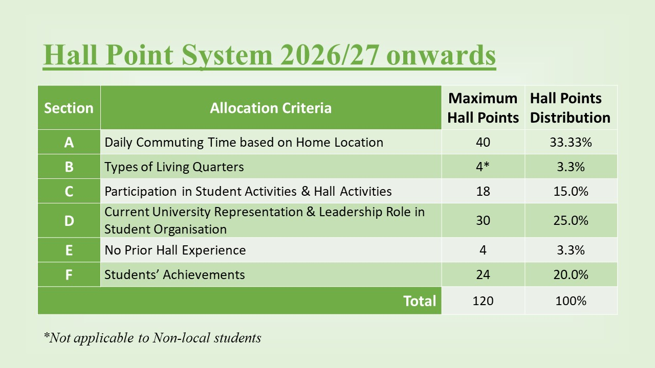 Based on the rationale for the provision of hall places to cater for the accommodation needs of students living far away from the University and to facilitate active campus involvement, the Hall Point System accords fair treatment to all applicants in need of on-campus accommodation.