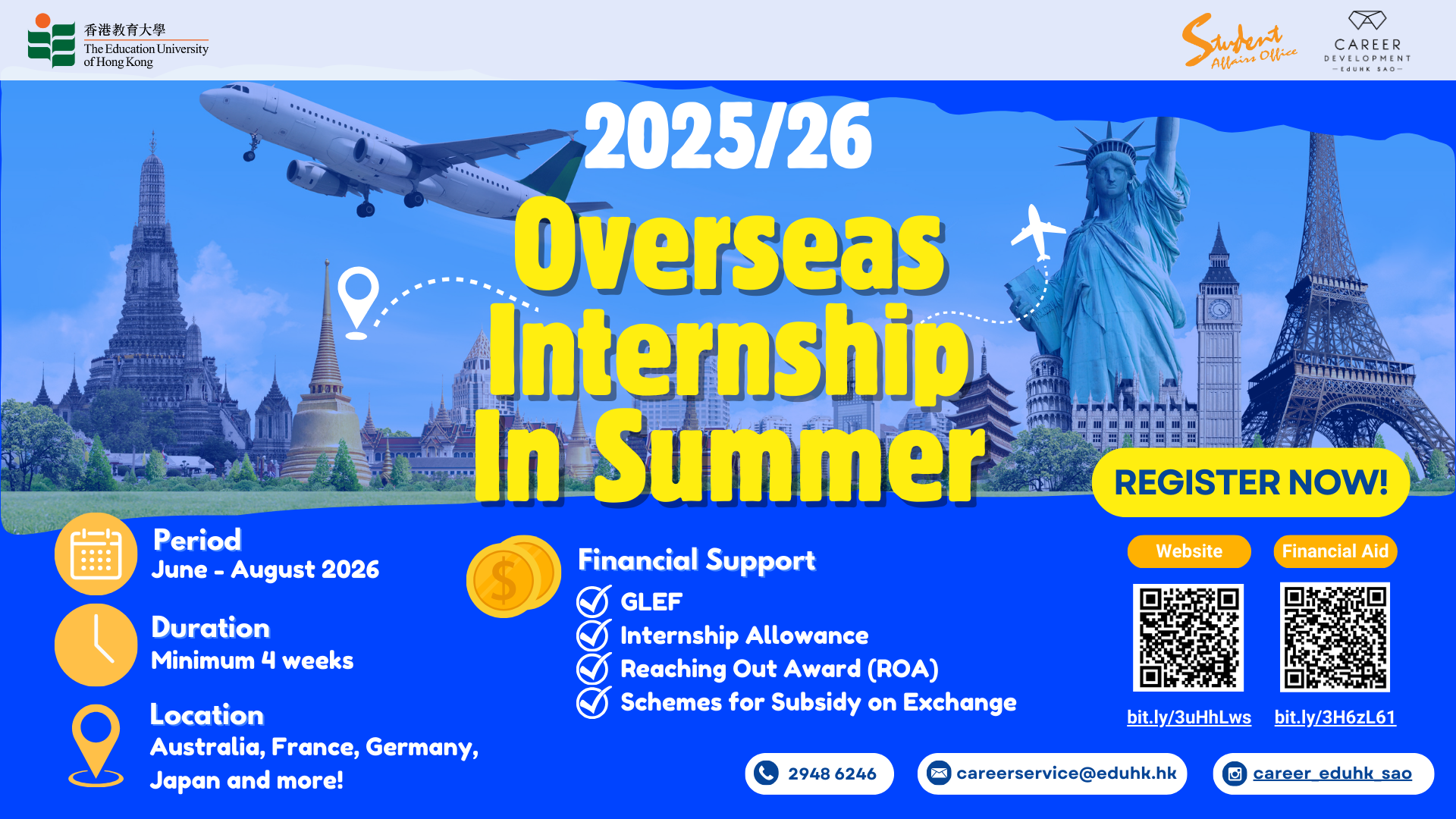 Your internship application will be submitted directly to the internship organisation. Applicants might be screened by their interview performance and quality of CV by overseas internship organizations or host companies. Therefore, you are highly recommended to view the video conducted by SAO to learn about the basic requirements and tips to write an up-to-standard CV before your submission. Click here to study the video, learning guide and resources prepared by SAO for preparation.