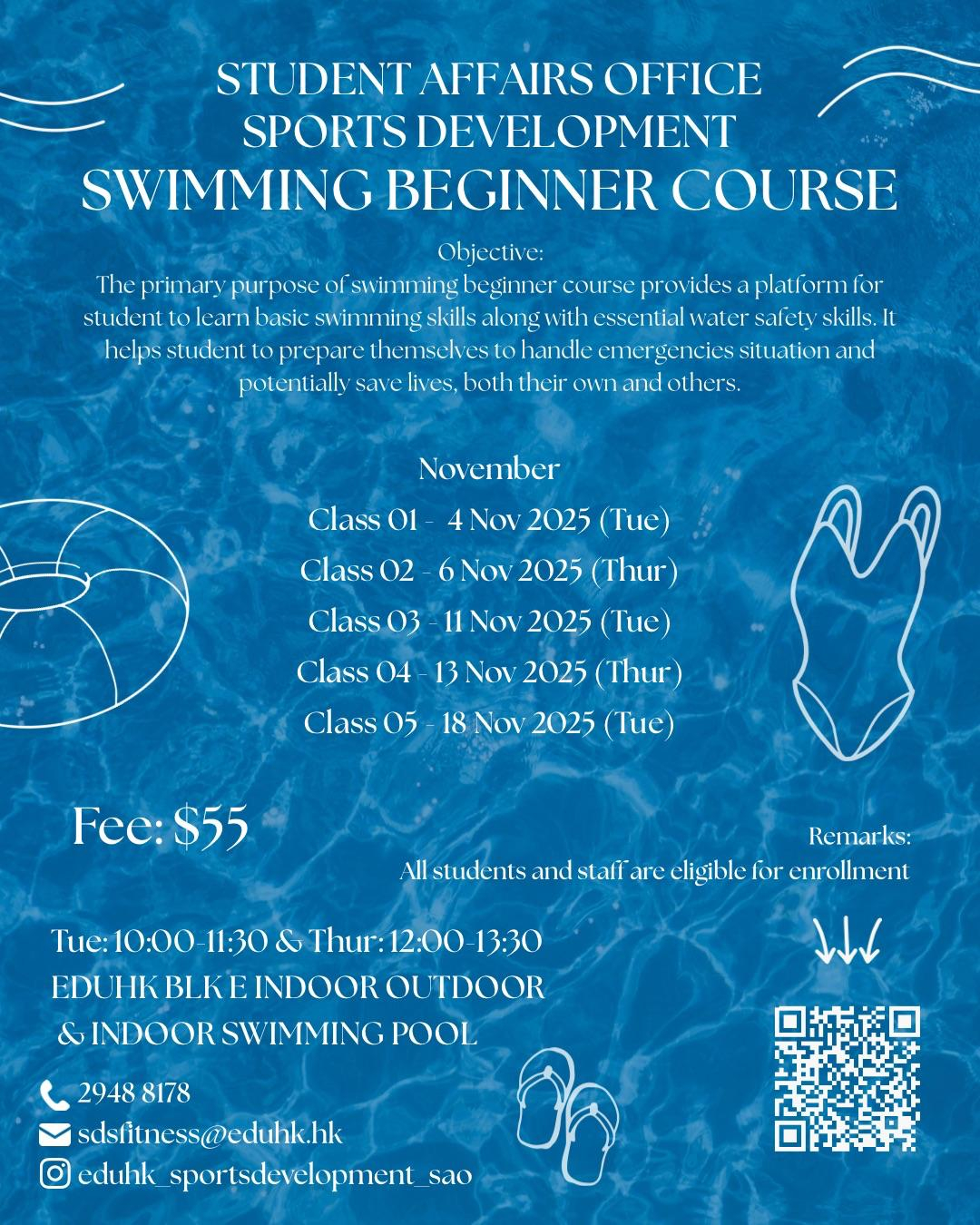 | Swimming Beginner Course - Class 02 | 6 Nov (Thur) | 12:00-13:30 | Outdoor Swimming Pool |