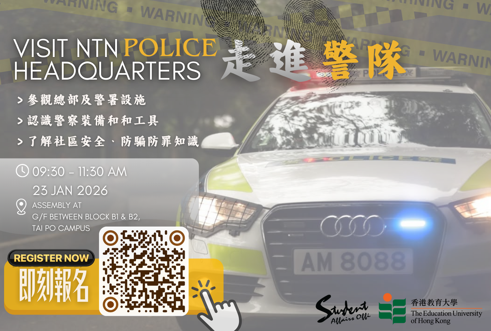 学生事务处将举办「参观香港警务处新界北总区总部 & 大埔警署」活动,透过亲身参观香港警务处新界北总区总部及警署设施,了解各部门的职能和工作范畴,认识警察装备和和工具,如制服、武器、防暴装备、巡逻车辆等。大家还将会了解社区安全、防骗防罪知识及自我保护技巧。