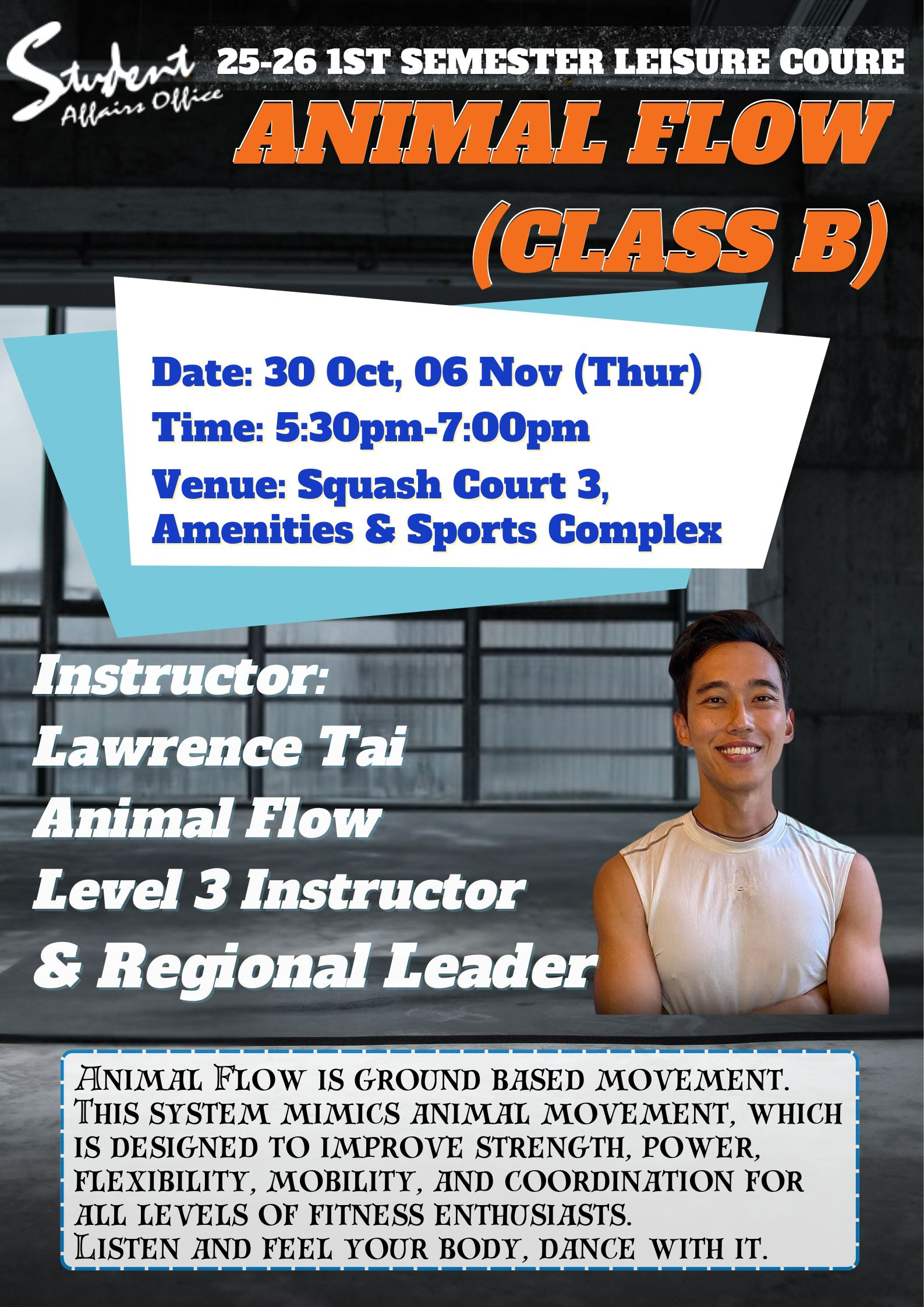 | 动物流 (B班) | 10月30日, 11月6日(四) | 5:30pm-7:00pm | 3号壁球场 |