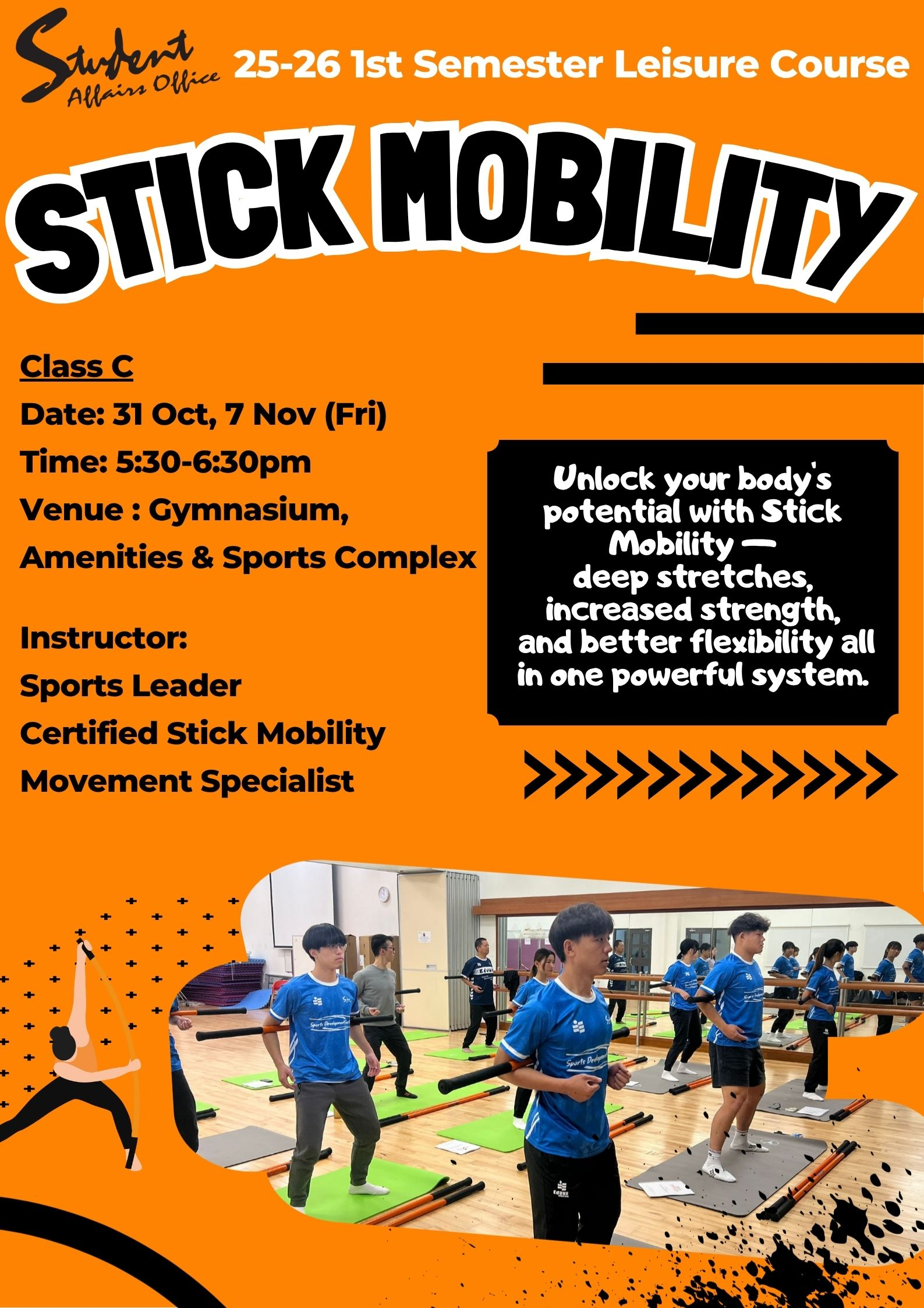 | Stick Mobility (B班) | 10月14日, 10月21日 (二) | 5:30pm-6:30pm | 舞蹈室 |