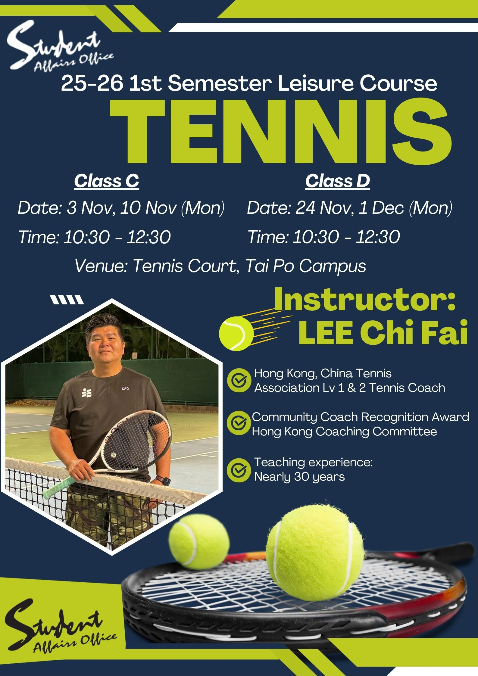 | 网球 (A班) | 10月15日, 10月22日 (三) | 10:30am-12:30pm | 网球场 |