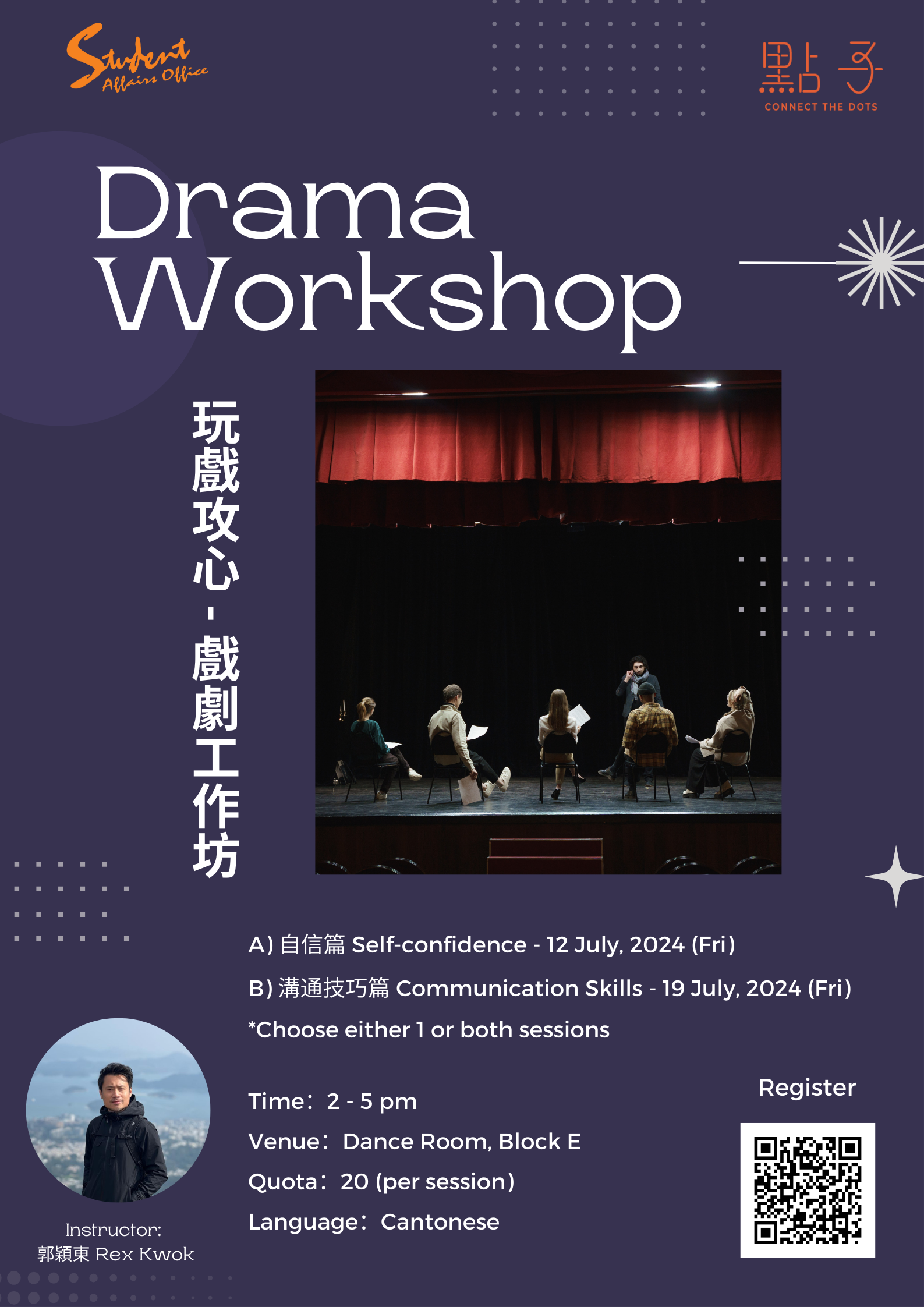 戲劇除了帶給人快樂,也能夠影響人的心理素質及溝通技巧,改善人際關係。參與戲劇遊戲,提升表演技巧,同時學習如何運用聲線、動作、表情去增加自信及增強溝通能力。不要錯過如此精彩戲劇工作坊!