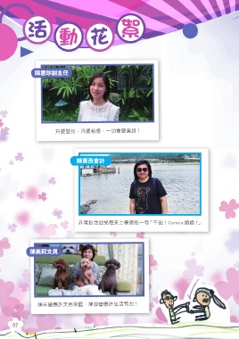 活 動 花 絮 陳惠珍副主任 只要堅持,只要相信,一切會更美好! 陳惠燕會計 非常掛念幼兒每天上學時的一句「午安!Connie 姐姐!」 陳美莉文員 神未曾應許天色常藍,神卻曾應許生活有力! 07