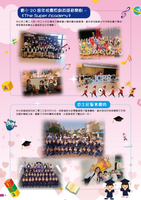 賽小 20 周年校慶原創英語音樂劇 - 《The Super Academy》 中心於二零二三年一月二十九日參加了賽馬會小學的舞台劇表演,當天幼兒都細心打扮而且盡力演出, 享受著站在舞台上展現自信心的機會! 迪士尼畢業慶典 中心幼高班幼兒於二零二三年三月六日,在香港迪士尼樂園參與了畢業慶典,當天幼兒亦同時參與了不同 主題的學習之旅,觀看了不同的慶典及滙演,大家都享受了難忘的一天。 9