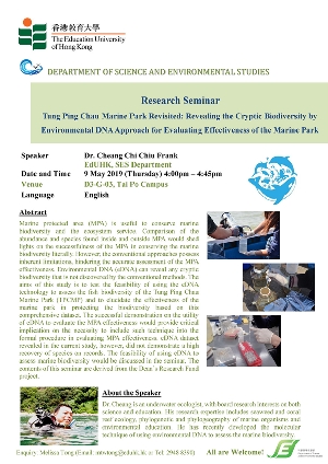 Research Seminar “Tung Ping Chau Marine Park Revisited: Revealing the Cryptic Biodiversity by Environmental DNA Approach for Evaluating Effectiveness of the Marine Park” to be organized by the Department of Science and Environmental Studies (SES). Details of the seminar are as follows: