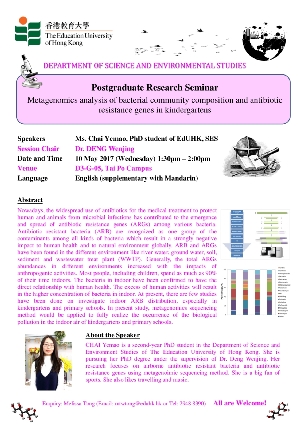 CHAI Yemao is a second-year PhD student in the Department of Science and Environment Studies of The Education University of Hong Kong. She is pursuing her PhD degree under the supervision of Dr. Deng Wenjing. Her research focuses on airborne antibiotic resistant bacteria and antibiotic resistance genes using metagenoimic sequencing method. She is a big fan of sports. She also likes travelling and music.
