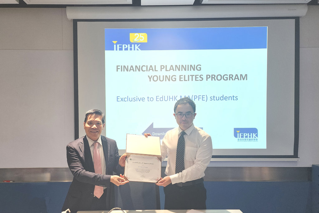 Dr. Keith Yu, Vice President (Development) of the Institute of Financial Planners of Hong Kong, shared the latest developments in the wealth management industry in the Greater Bay Area and the career opportunities for Certified Financial Planners (CFP) with students enrolled in the personal finance programme at The Education University of Hong Kong.