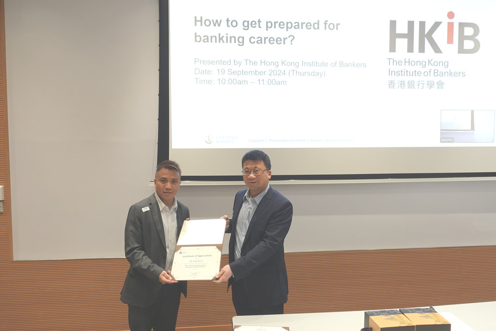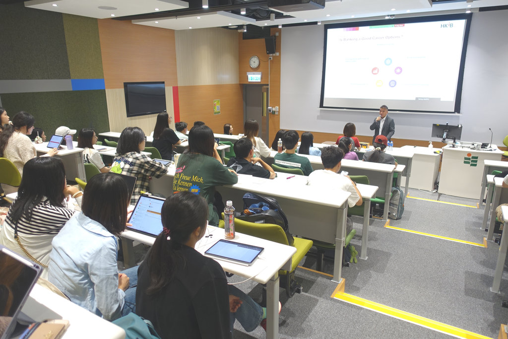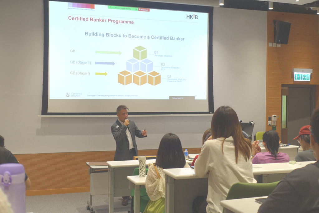 The Personal Finance programme invited Mr. Kenneth YU from the Hong Kong Institute of Bankers to share green and sustainable finance in the banking industry and exchange views with students on career development in the banking and green finance sectors in Hong Kong.
