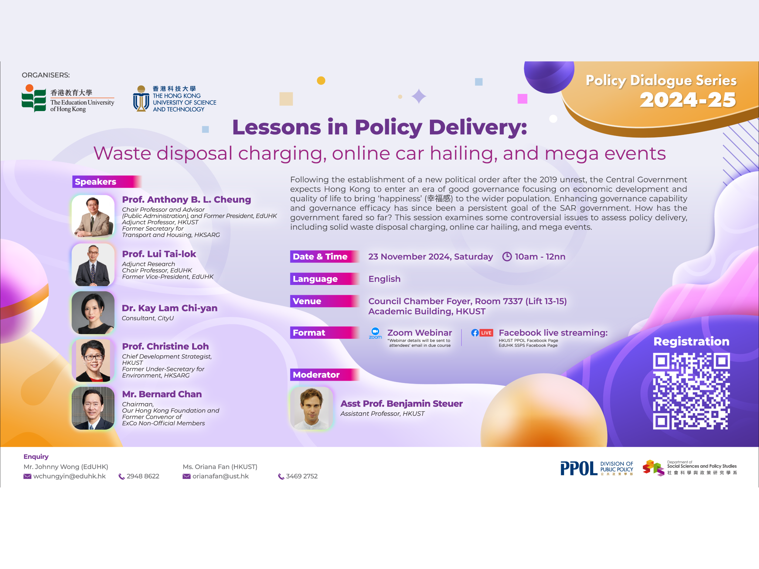 Fellowing the establishment of a new political order after the 2019 unrest, the Central Government expects Hong Kong to enter an era of good governance focusing on economic development and quality of life to bring 'happiness' (幸福感)to the wider population. Enhancing governance capability and governance efficacy has since been a persistent goal of the SAR government. How has the government fared so far? This session examines some controversial issues to assess policy delivery, including solid waster disposal charging, online car hailing, and mega events.