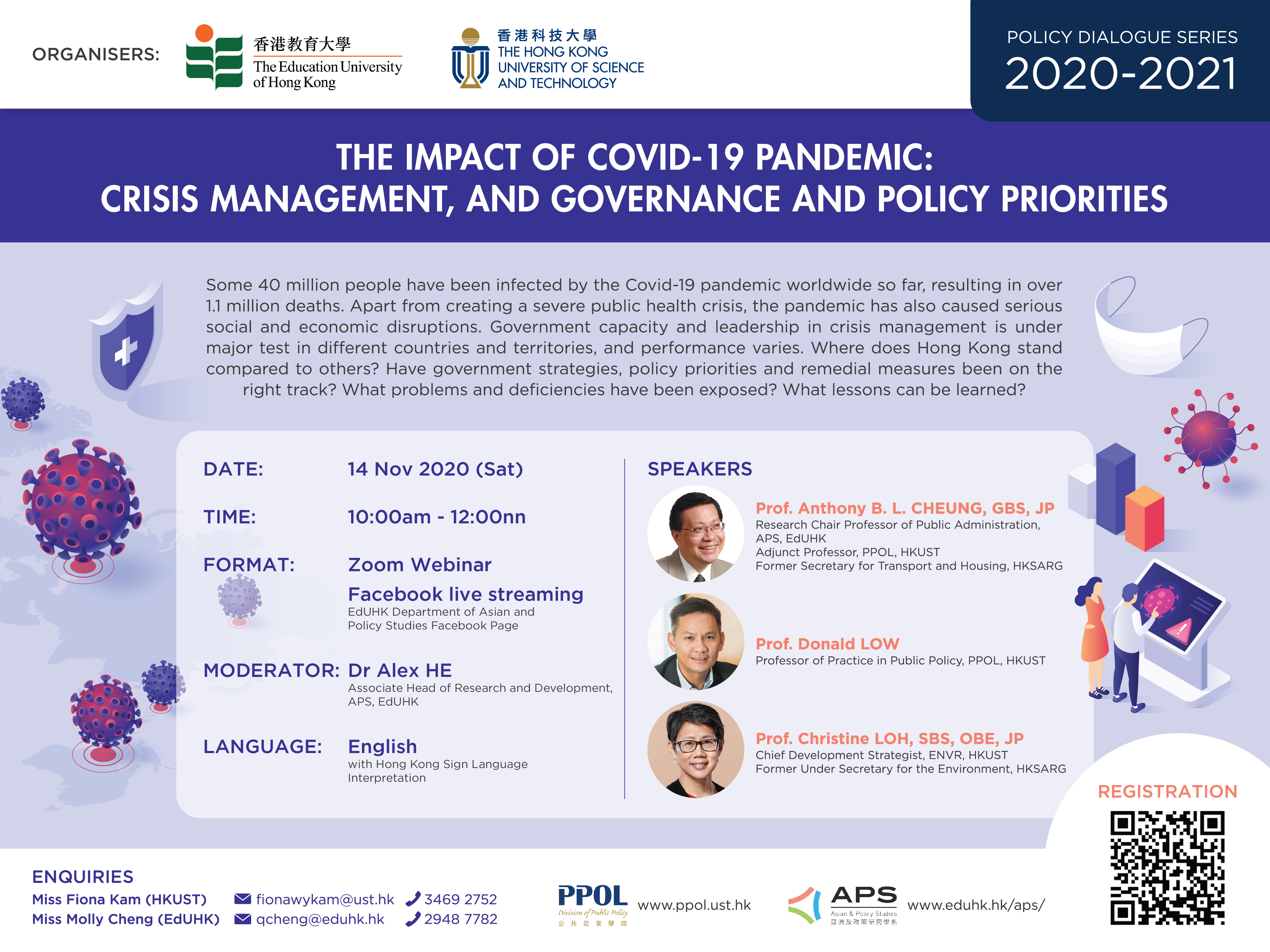 Due to the implementation of public health measures to reduce the spread of the COVID-19 virus on university campuses, thePolicy Dialogue Series will adopt an online mode in semester 1 via zoom. If the situation allows in Semester 2, an additional physical seminar will be held at EdUHK/ HKUST campus. More details will be announced later.