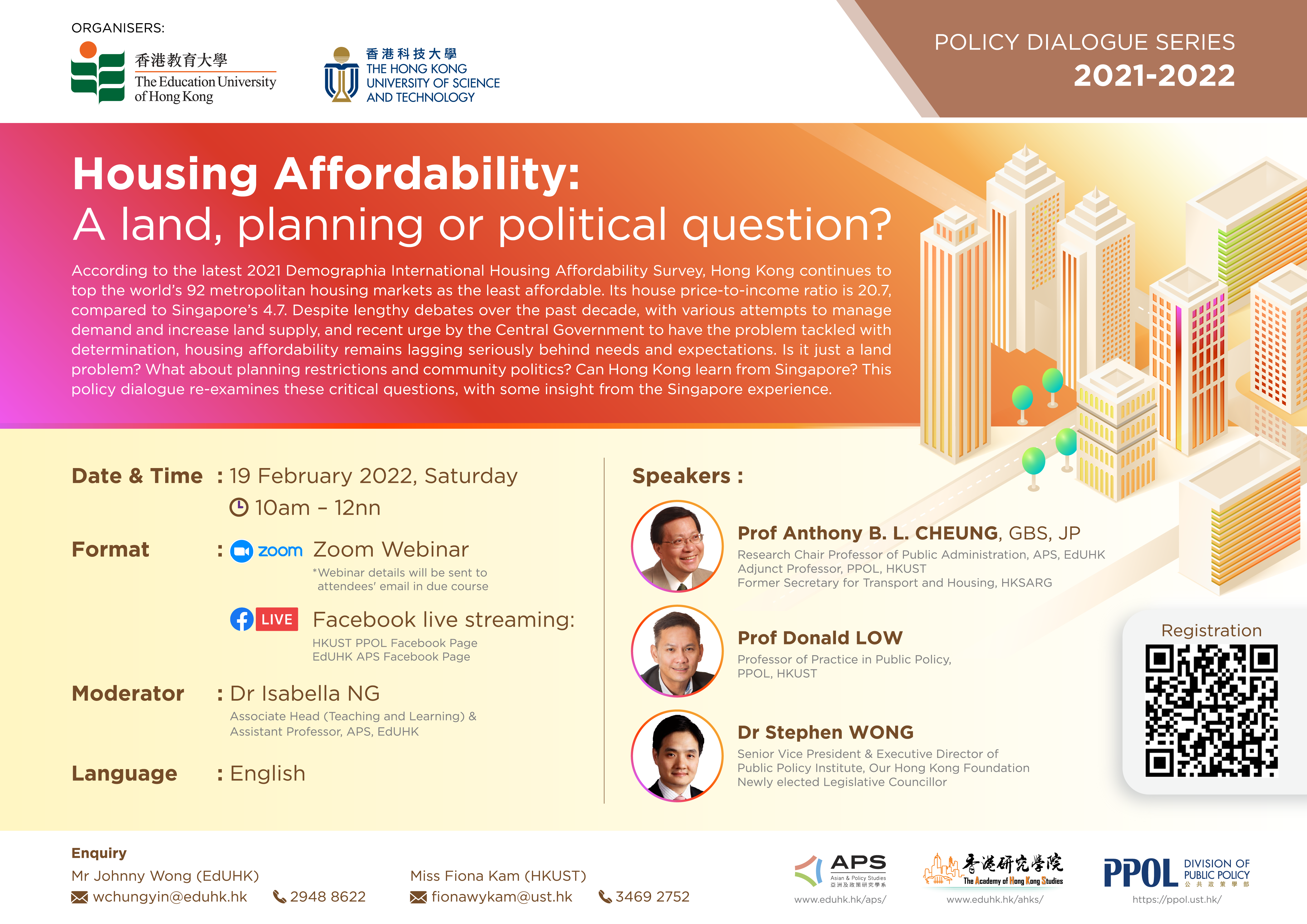 According to the latest 2021 Demographia International Housing Affordability Survey, Hong Kong continues to top the world’s 92 metropolitan housing markets as the least affordable. Its house price-to-income ratio is 20.7, compared to Singapore’s 4.7. Despite lengthy debates over the past decade, with various attempts to manage demand and increase land supply, and recent urge by the Central Government to have the problem tackled with determination, housing affordability remains lagging seriously behind needs and expectations. Is it just a land problem? What about planning restrictions and community politics? Can Hong Kong learn from Singapore? This policy dialogue re-examines these critical questions, with some insight from the Singapore experience.