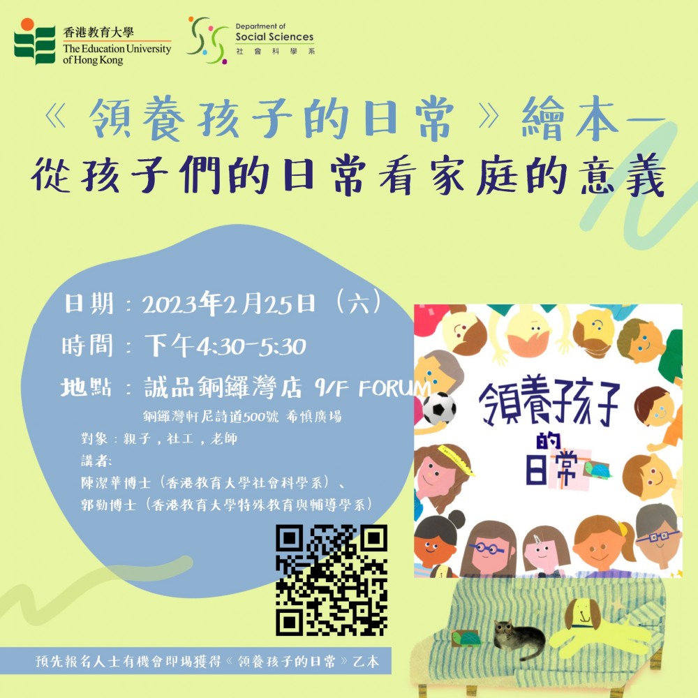 很多人也許聽過「領養」這個概念,卻未必真正認識領養家庭。陳潔華博士(香港教育大學社會科學系)與郭勤博士(香港教育大學特殊教育與輔導系)推出本地第一本關於領養孩子心聲的繪本:《領養孩子的日常》。基於十三個香港領養孩子的訪問製作而成,這本繪本雖然内容平實,沒有戲劇性的情節,卻從孩子的角度向讀者分享領養家庭的生活經驗、以及領養孩子對家庭,家人的理解。今次分享將帶大家走進領養孩子的世界,並和大家一起探討什麼是家庭?誰是家人?以及家庭的意義是什麼。