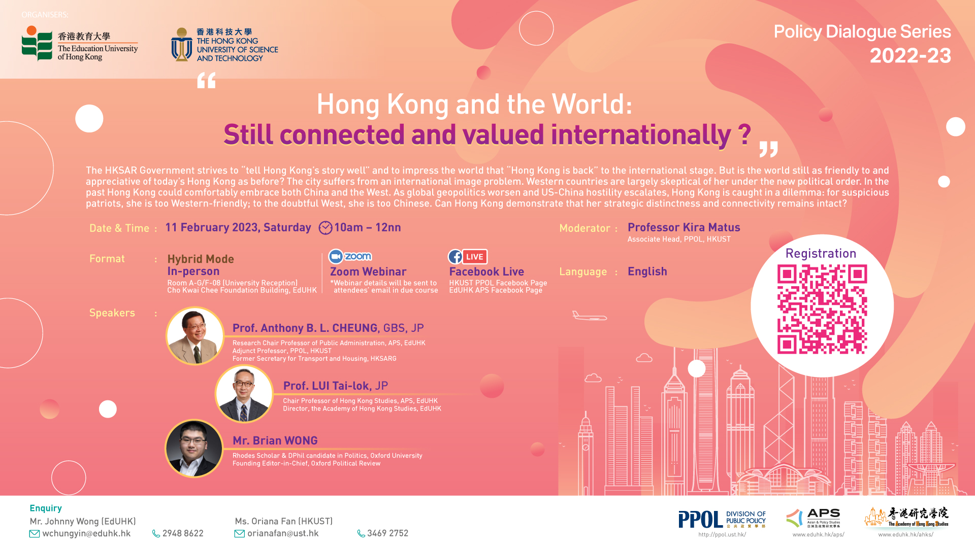 The dialogue series is co-organised by the Department of Asian and Policy Studies (APS) and the Academy of Hong Kong Studies at The Education University of Hong Kong (EdUHK), and the Division of Public Policy (PPOL) at The Hong Kong University of Science and Technology (HKUST).